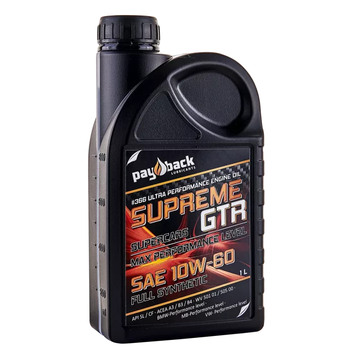 366 SUPREME GTR 10W-60 är en extrem, helsyntetisk motorolja för SuperCars och högeffektsmotorer. För gatbruk och proffisionellt tävlingsbruk. Den högpresterande additivtekniken med basoljemixen för hög värme och viskositetsstabilitet ger ett tillförlitligt motorskydd under extrema driftförhållanden